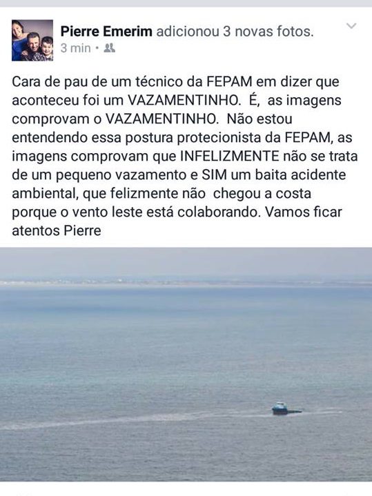 “Cara de pau de um técnico da FEPAM em dizer que o que aconteceu foi um VAZAMENTINHO. É, as imagens comprovam o VAZAMENTINHO. Não estou entendendo essa postura protecionista da FEPAM, as imagens comprovam que INFELIZMENTE não se trata de um pequeno vazamento e SIM um baita acidente ambiental, que felizmente não chegou a costa porque o vento Oeste está colaborando. Vamos ficar atentos. Pierre”, escreveu ele em sua conta no Facebook.