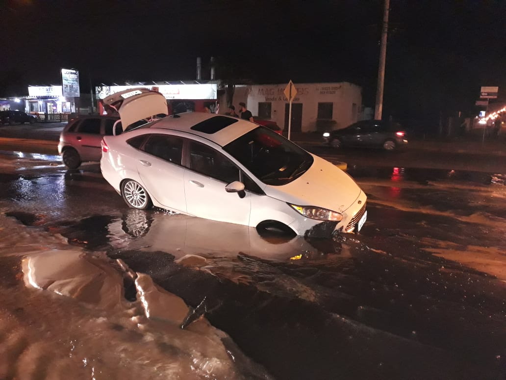 A motorista estava trafegando em via pública com seu veículo Ford/Fiesta, de cor branca, quando o carro caiu no buraco que estava coberto por água, não sendo possível de ser visualizado.