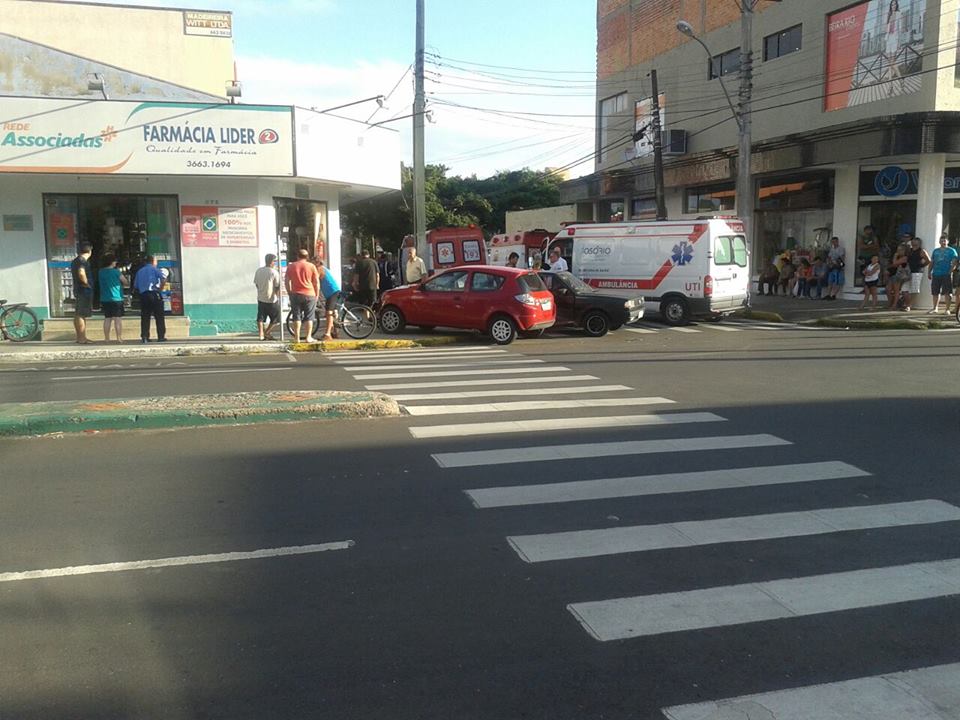Dois veículos colidiram e com impacto acabaram danificando a estrutura de uma farmácia, na esquina da Avenida Getúlio Vargas, esquina com Machado de Assis, no centro da cidade.