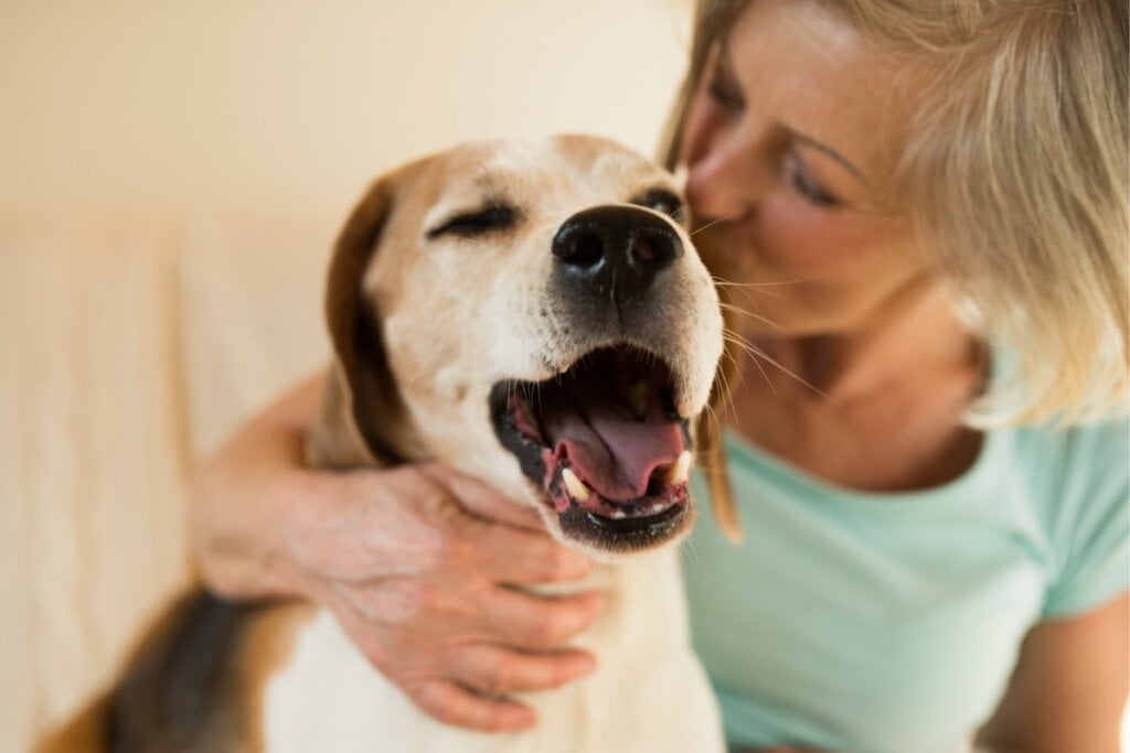 Cachorro feliz com uma mulher beijando a sua cabeça