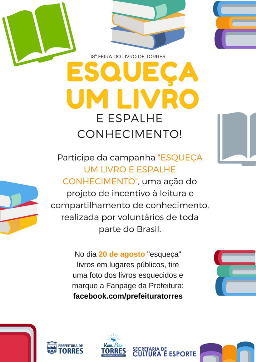 É simples e fácil participar, basta a gente “esquecer” livros nos lugares que escolher. A Secretaria Municipal de Cultura e Esporte convida todos os torrenses a fazerem parte dessa iniciativa. A recomendação é que os livros sejam deixados em local de movimento como supermercados, padarias, restaurantes, pontos de ônibus, bancos de praças, entre outros. O lugar fica a seu critério, mas não deixe de participar e incentivar. No bilhete, deve constar que o livro seja repassado depois da leitura. Quem encontra, leva para casa e depois esquece também. E o conhecimento se espalha.