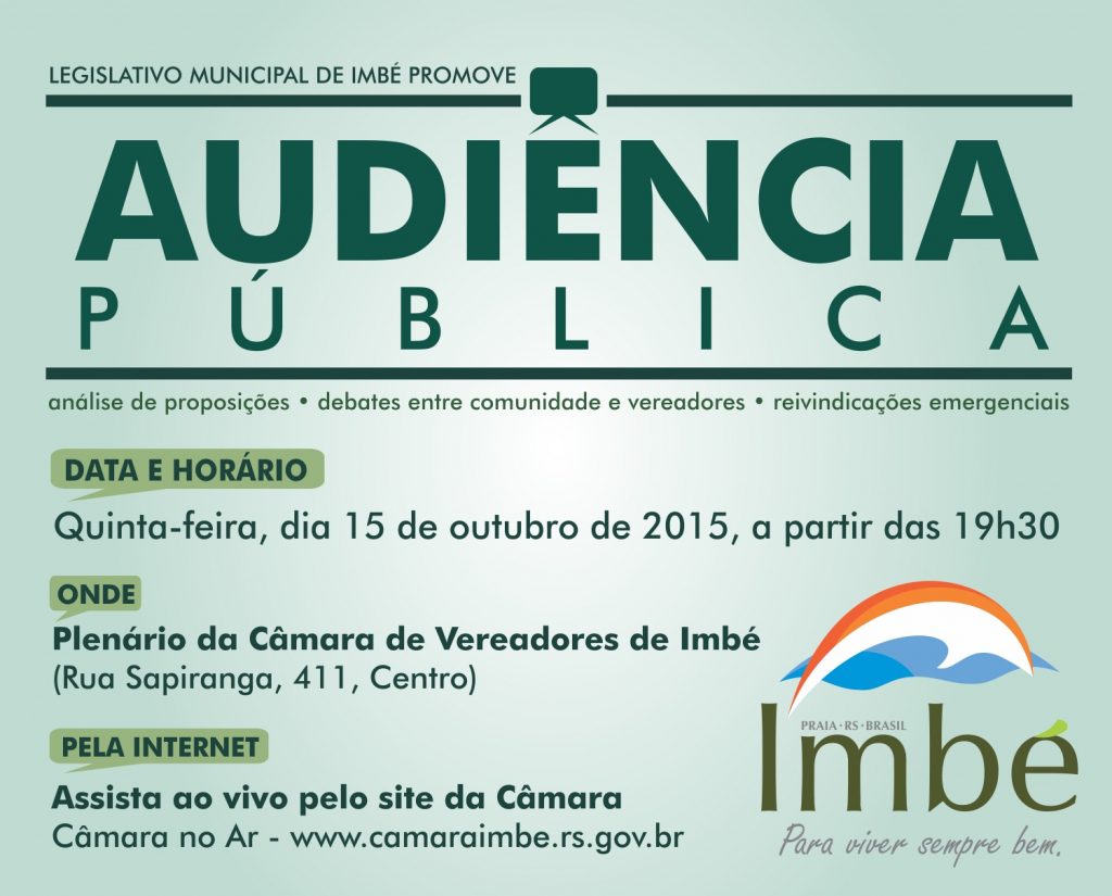 Objetivando a adoção de medidas de economia tendo em vista a abordagem feita pelos veículos de imprensa quanto aos gastos da Câmara de Vereadores de Imbé, o Legislativo Municipal promoverá uma audiência pública aberta à comunidade para apresentação de ideias que resultem em proposições de interesse popular.