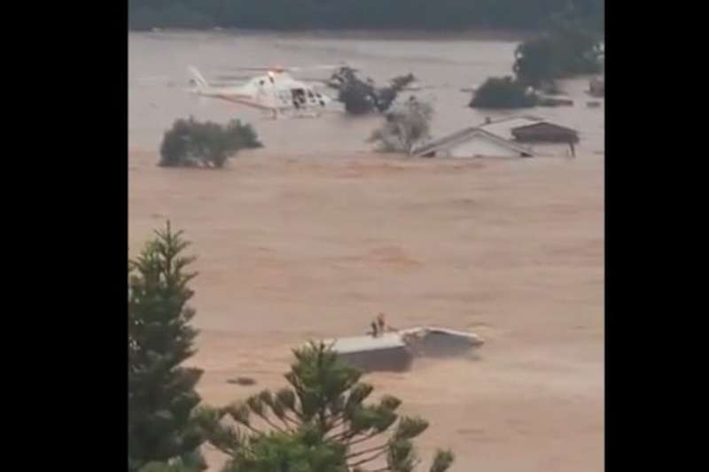 Um vídeo que circula nas redes sociais tem comovido os gaúchos, mostrando um helicóptero se aproximando de uma casa em meio à enchente para resgatar duas pessoas.