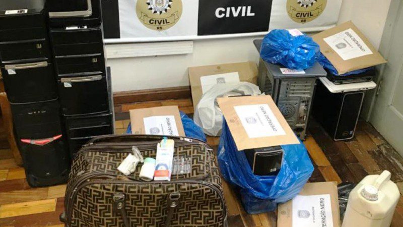 Foram apreendidos 10 computadores; 7 notebook; 11 celulares; 1 simulacro; 1 revólver; diversos documentos e anabolizante.